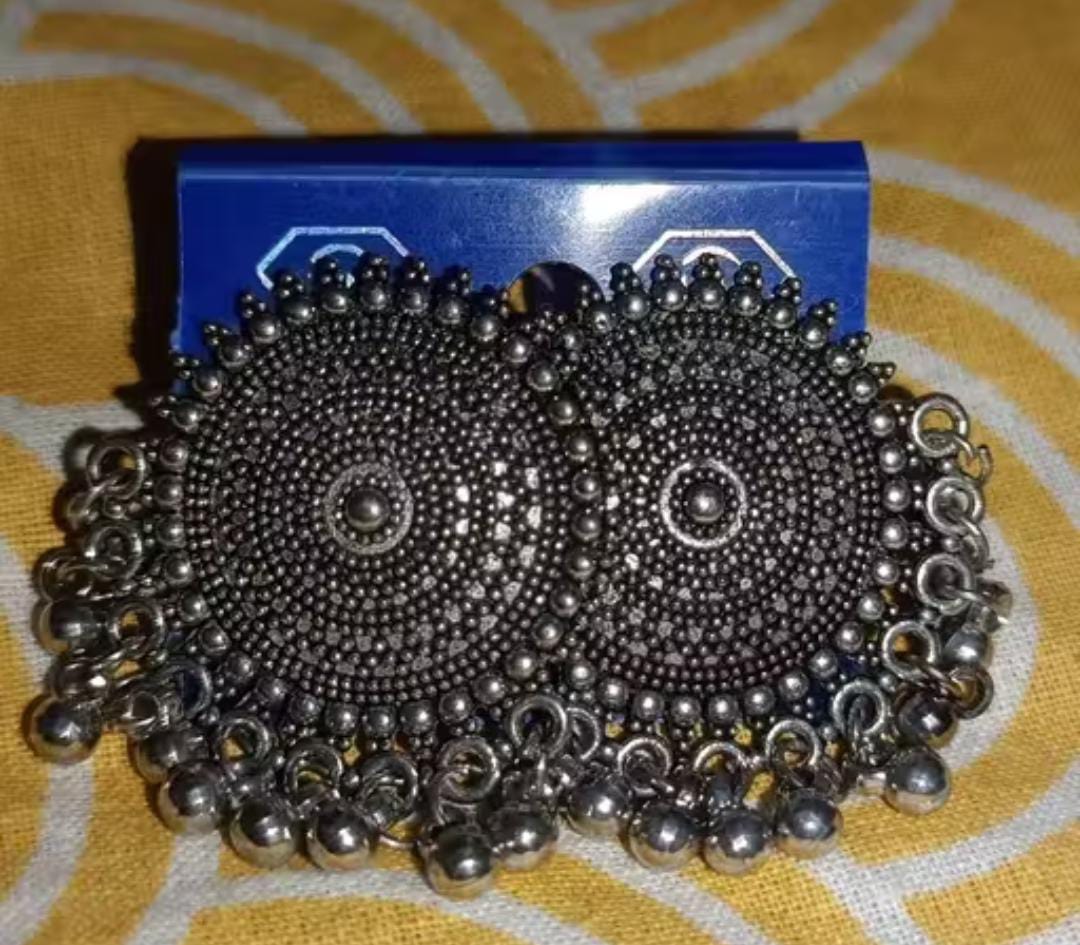 Upgrade your ethnic style with these beautiful oxidized round earrings. Designed with intricate detailing and tiny ghungroo beads, these earrings add a perfect traditional touch to your outfit. Lightweight and stylish, they are ideal for festive, party, or daily wear.
